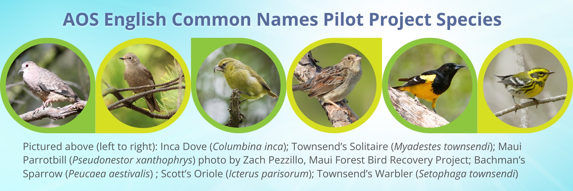 This group of species includes four eponymous names (Townsend’s Solitaire, Bachman’s Sparrow, Scott’s Oriole, Townsend’s Warbler); one of the three non-eponymous names recommended to be changed because they had derogatory or culturally unsuitable references (Inca Dove); and one name of an Hawaiian species (Maui Parrotbill) that had been recommended previously for changing to a local Hawaiian name (Kiwikiu), an action that would acknowledge the importance of considering Indigenous names, particularly for endemic species with limited ranges. Two of the species are year-round residents in the U.S. (Maui Parrotbill, Bachman’s Sparrow); three breed primarily in the U.S. and Canada but occur year-round regularly as far south as Mexico (Townsend’s Solitaire, Scott’s Oriole) or winter as far south as Costa Rica (Townsend’s Warbler); and the sixth (Inca Dove) is a Middle American species with a significant portion of its breeding range in the southern U.S., and not within the original range of the Inca people. The Bachman’s Sparrow is considered Near Threatened on the IUCN’s Red List of Threatened Species and the Maui Parrotbill is Critically Endangered (BirdLife International 2024); both provide significant opportunities to educate the public about conservation challenges. All these species provide opportunities for educating the public about the need to change harmful and exclusionary English common names. At the conclusion of this pilot project, the committee will be asked to provide an assessment of how well the new structure and process worked for engaging the public and selecting the replacement names.