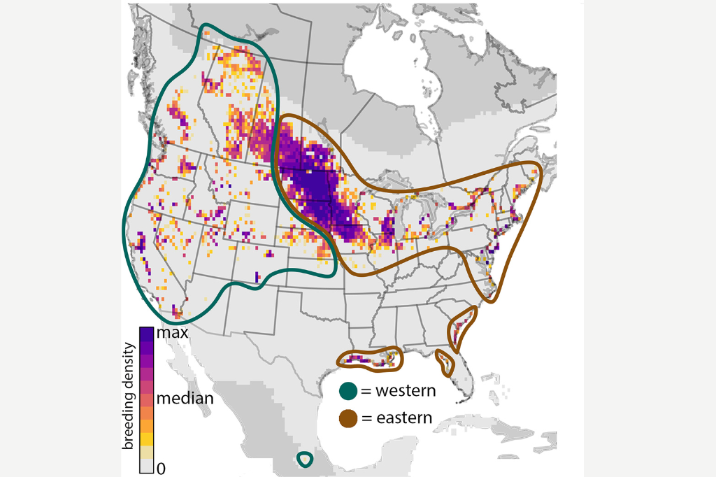Listen to these four males on territories at Nicolle Flats, Saskatchewan, Canada. From left to right: a pure western male in both songs and genes, a western singer with 100 percent eastern ancestry, a mixed singer with 100 percent eastern ancestry, and a pure eastern male in both songs and genes.